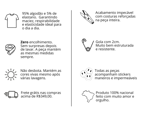 Sua composição leva 95% de algodão, que traz repirabilidade e maciez e 5% de elastano para elasticidade, conforto e ajuste.